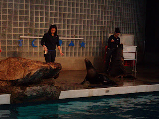 We started off with a packed picnic lunch. We found a nice quiet area on the outskirts of the shopping village to eat. They have benches all over the place, so we picked one and chowed down. Then we mosied on over to the aquarium for the sea lion show. Both of us loved it, though I'll admit I think I was enthralled just the tiniest bit more. I loved the sea lion show as a kid. It was super exciting because this time, the sea lions actually swam across their pool and came out of the door right near the audience! The big 900 pounder came out right in front of us. He's magnificent.
